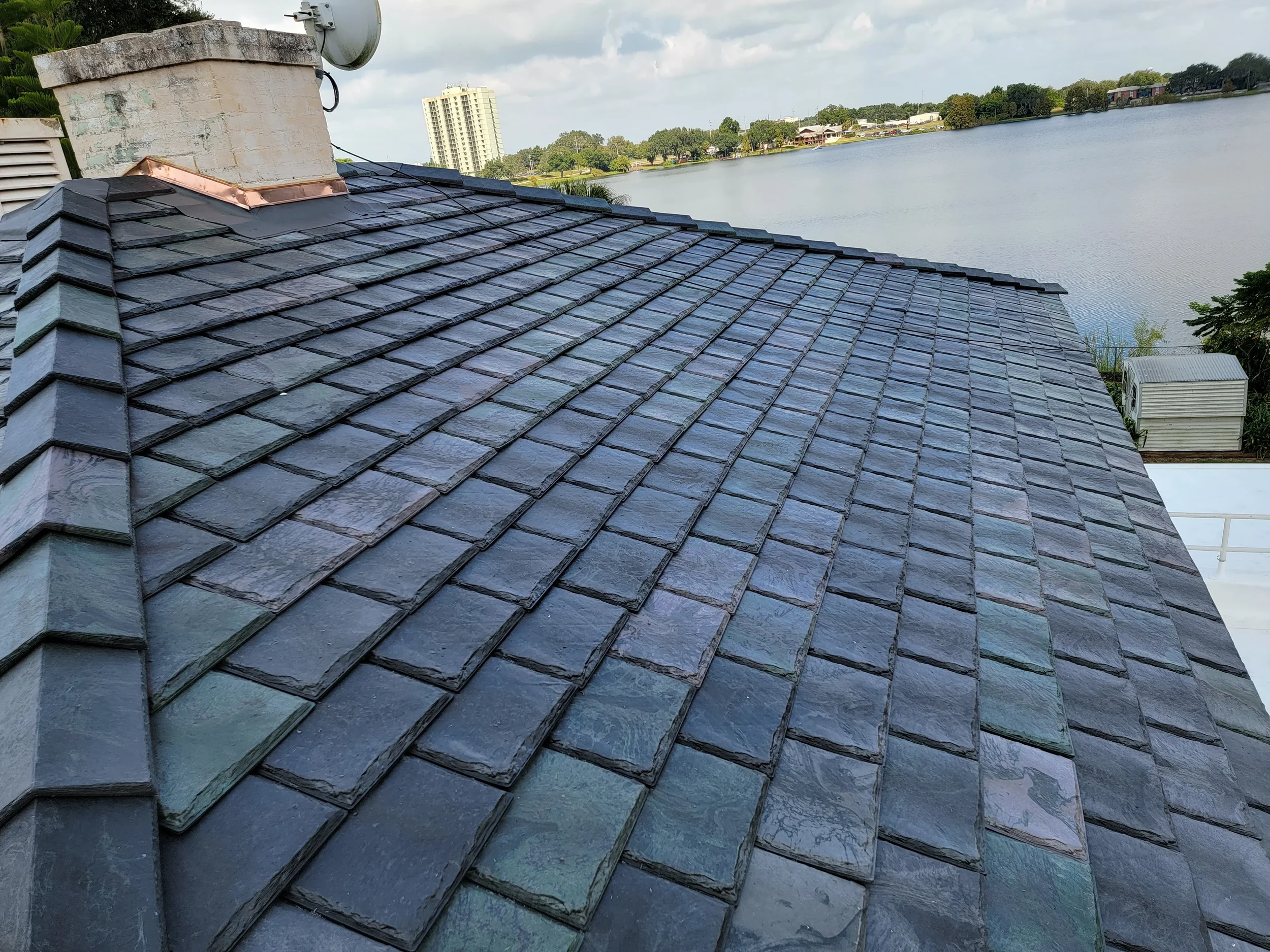 Slate roofing is made from natural stone, split into durable tiles that can last 75+ years with low maintenance. It’s commonly used on luxury homes and landmark buildings.